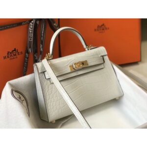 Hermes Kelly Mini II Handmade Bag In Beton Crocodile Embossed Leather