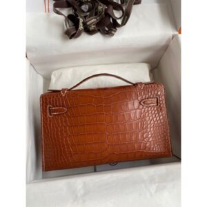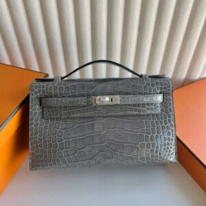 Hermes Kelly Pochette Handmade Bag in Girs Ciment Shiny Alligator Leather