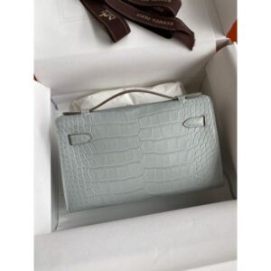 Hermes Kelly Pochette Handmade Bag In Pearl Grey Matte Alligator Leather