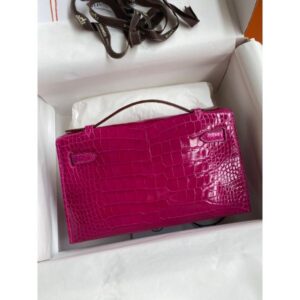 Hermes Kelly Pochette Handmade Bag In Rose Extreme Shiny Alligator Leather