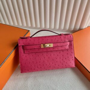 Hermes Kelly Pochette Handmade Bag in Rose Tyrien Ostrich Leather