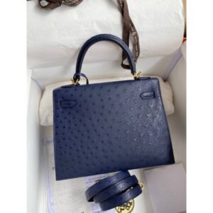Hermes Kelly Sellier 25 Handmade Bag In Blue Iris Ostrich Leather