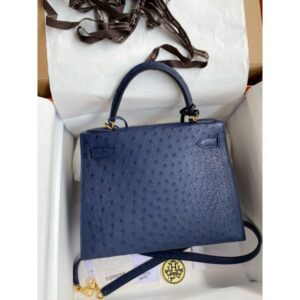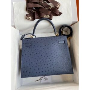 Hermes Kelly Sellier 28 Handmade Bag in Blue de Malte Ostrich Leather