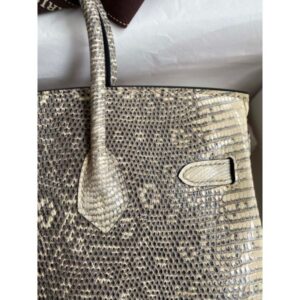 First adorned on the arm of the infamous Jane Birkin back in 1984, the Hermes Birkin Bag quickly soared to the top of the popularity charts, becoming one of the most sought after bags in the fashion industry. The Retourne style Birkin bag has a soft and relaxed look. Made from Lizard leather, this skin is extremely valuable and rare and is processed as little as possible to maintain its natural texture. The 25 cm size is a glamorous choice for day to evening, cocktails or the red carpet.