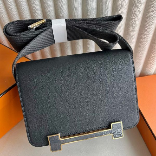Embrace a cool and edgy vibe with the Hermès Geta. A more casual bag than other Hermès styles, it fills a crucial niche in your wardrobe. It is handcrafted from luxurious Chèvre Mysore goatskin with a grain that softens over time. The bag’s design was inspired by Japanese wooden platform sandals. The chic H closure is repeated on the back. Set low on the bag, the metal hardware is inset with leather matching the bag. The “legs” of the H closure also serve at the bag’s feet, raising the bottom of the bag up off any surface you place it on.