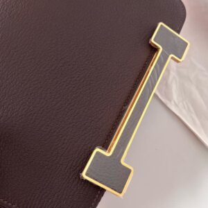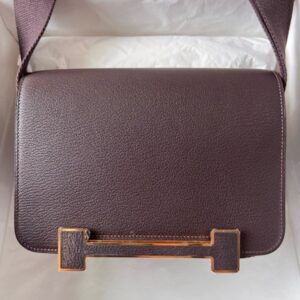 Embrace a cool and edgy vibe with the Hermès Geta. A more casual bag than other Hermès styles, it fills a crucial niche in your wardrobe. It is handcrafted from luxurious Chèvre Mysore goatskin with a grain that softens over time. The bag’s design was inspired by Japanese wooden platform sandals. The chic H closure is repeated on the back. Set low on the bag, the metal hardware is inset with leather matching the bag. The “legs” of the H closure also serve at the bag’s feet, raising the bottom of the bag up off any surface you place it on.