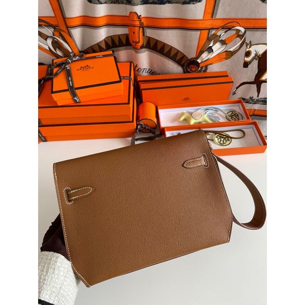 With its new clean lines, the Kelly DĂ©pĂȘches document holder combines Kelly’s iconic clasp with beveled corners and the construction codes of the Hermes menswear universe. With its rounded bottom and the purity of its leather surface, it asserts itself as a day-to-day essential to slide your laptop and documents in. A lightweight pouch and removable strap provides a more casual fit and completes the line with elegance.