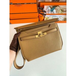 With its new clean lines, the Kelly DĂ©pĂȘches document holder combines Kelly’s iconic clasp with beveled corners and the construction codes of the Hermes menswear universe. With its rounded bottom and the purity of its leather surface, it asserts itself as a day-to-day essential to slide your laptop and documents in. A lightweight pouch and removable strap provides a more casual fit and completes the line with elegance.
