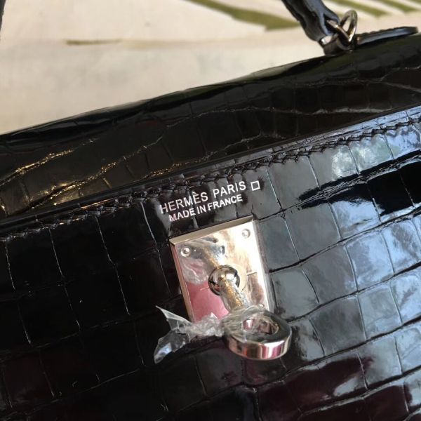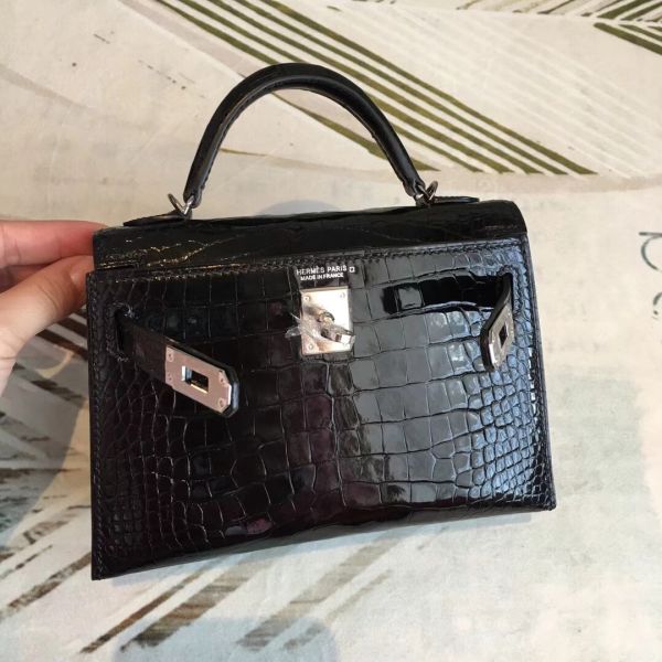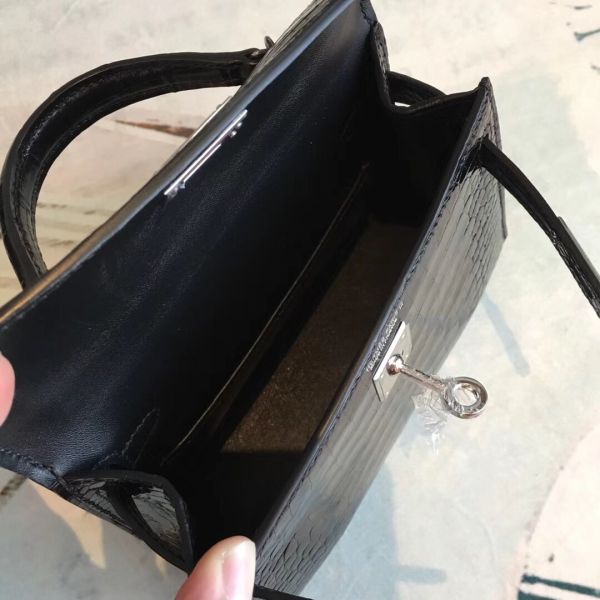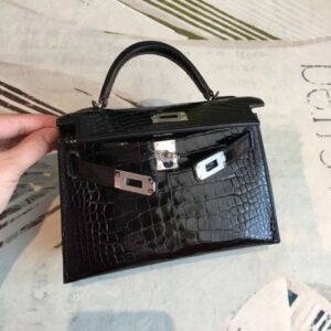 Hermes Kelly Mini II Handmade Bag In Black Alligator Crocodile