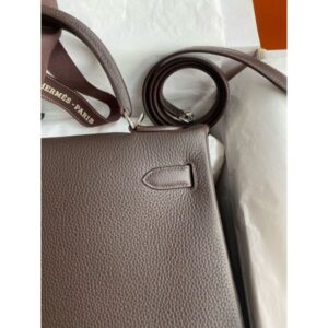 The iconic trapezoid shape of the Hermes Kelly 32 was a striking departure from the ornate handbag styles of the day. The chic look took the world by storm when legendary actress, and crowned princess of Monaco, Grace Kelly was photographed holding her Hermès Sac à Dépêches bag to shield her baby bump from the paparazzi. This Kelly 32 bag in Retourne, a relaxed style made by placing the stitches inside the bag, thanks to the taurillon Clemence leather. It is an ideal daily bag for the busy woman on the go. It is spacious enough to carry all your everyday essentials.