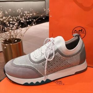 A reinterpretation of a classic style, The Hermes Addict Sneaker in bicolor knit with optical illusion, these pairs feature petrol zigzag rubber insert on the front and grey rubber insert on the back, white rubber midsole and white goatskin insole and lining.