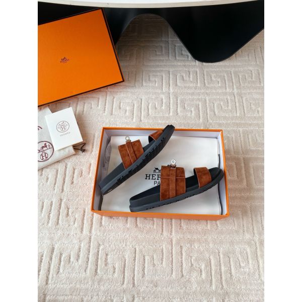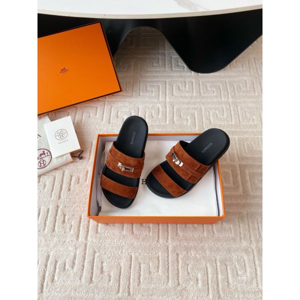 The Hermes Jackson sandal offers an elegant style with relaxed appeal. The design presents the straps, highlighting the suede calfskin. Completed by a Hermes signature on the Kelly buckle and black rubber sole, the sandal will pair easily with Bermuda shorts or jeans.