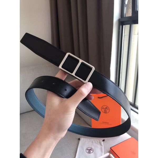 Hermes H Guillochee Reversible Belt 32MM in Black and Blue Epsom Calfskin