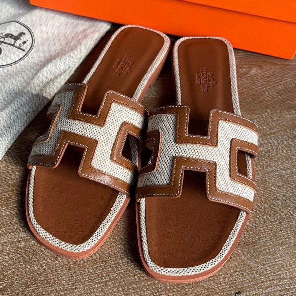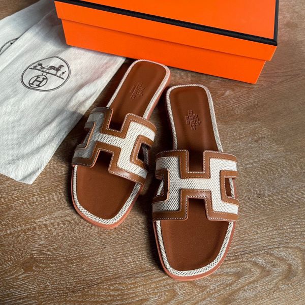 Hermes Oran Slide Sandals in Gold Swift Calfskin with Canvas