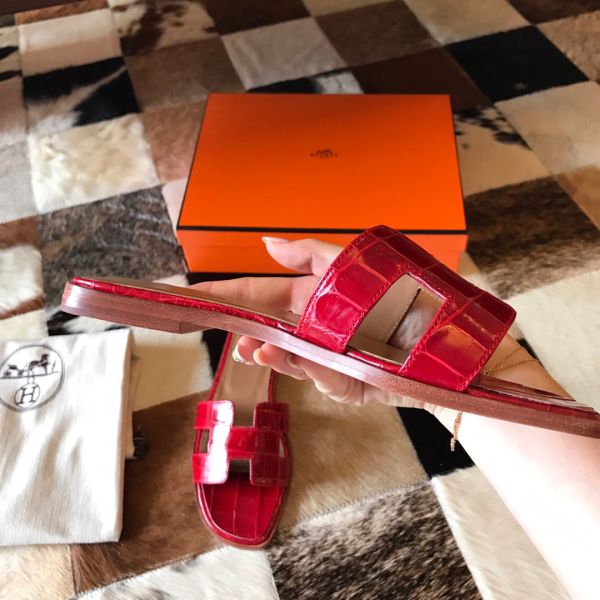 Hermes Oran Slide Sandals In Red Shiny Niloticus Crocodile Skin
