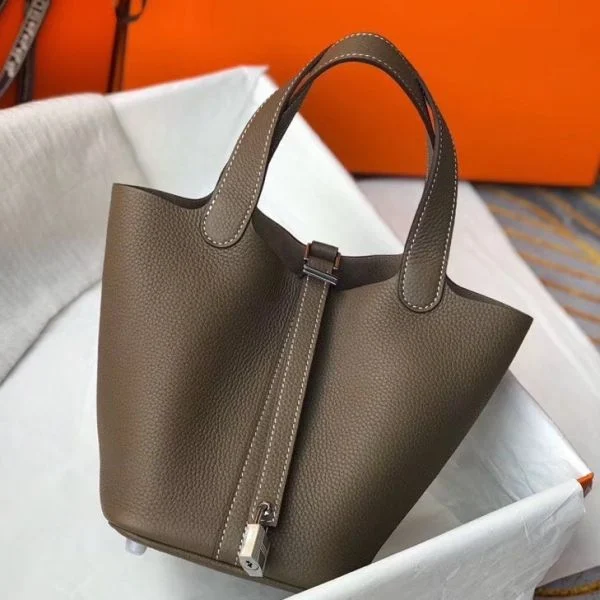 The Hermes Picotin Lock bag, inspired by horse troughs, this timeless and minimalist piece gives material star billing. Looks more like a small buckle bag. This is a tote version, take the handles, load it with your personal items and you are good to go. This bag has zero problem swallowing all your essentials without expanding.