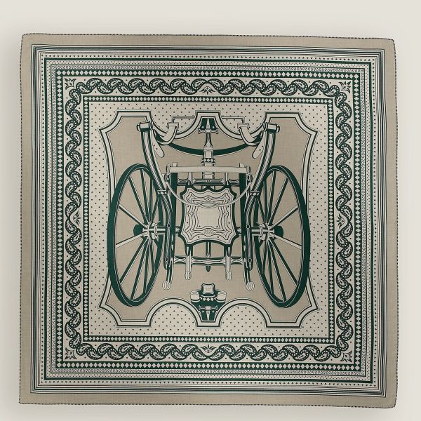 The phaeton, named after the son of the Sun in Greek-Latin mythology, is a horse-drawn carriage that enjoyed its heyday in late 18th-century France and England. This lightweight, maneuverable vehicle allowed its driver to move around town with ease. Designer Pierre Marie presents a perspective of the back of the model in the Émile Hermès collection. The high wheels and delicate painted decoration are framed by a bandana list that gives depth and lightness to the design.