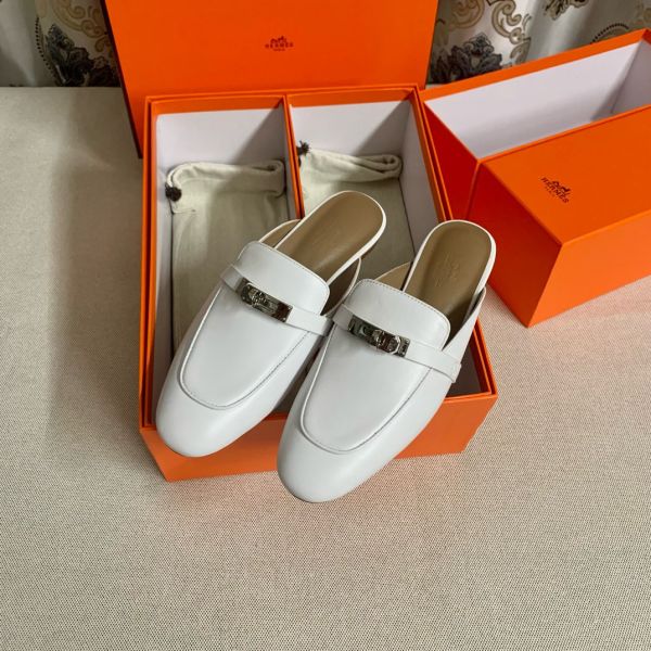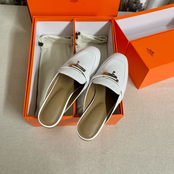 Hermes Oran Slide Sandals in White Swift Calfskin with Printed Lining